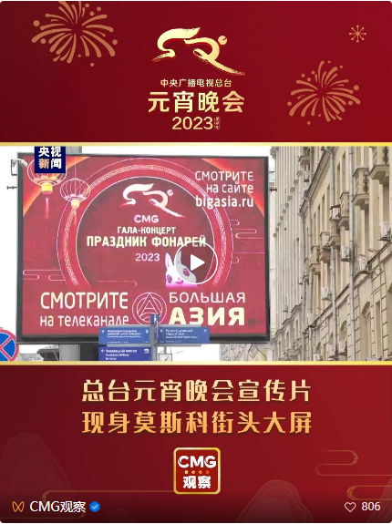自2月3日起,在位于莫斯科中央行政區的法捷耶夫街、祖博夫斯基廣場、帕維列茨車站等街區,總臺春晚吉祥物“兔圓圓”在70塊街頭大屏幕上歡騰悅動,向莫斯科居民展示總臺2023年元宵晚會宣傳片。