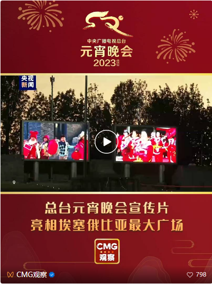 位于埃塞俄比亞首都亞的斯亞貝巴市中心的梅斯克爾廣場的大屏幕也再次亮起中國紅,五塊LED大屏幕循環播放元宵晚會宣傳片,引發在場民眾的關注。