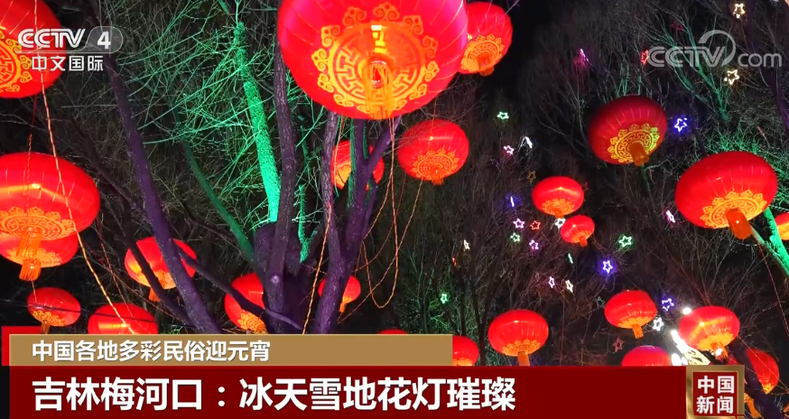 在吉林梅河口海龍湖景區,以中華傳統文化為主要元素的花燈展流光溢彩、璀璨奪目。此外,2萬多只大紅燈籠掛滿枝頭,在白雪皚皚間交相輝映,營造出特有的東北年味。
