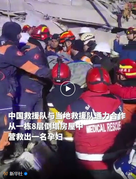 中國救援隊副隊長趙洋告訴新華社記者,8日下午6時許,土方營救人員聯系中國救援隊,說在哈塔伊省安塔基亞市一棟8層倒塌房屋的廢墟中發現一名孕婦,中國救援隊隨即到現場進行評估,與土方共同制定營救方案,全程提供專家指導與技術裝備支持,雙方通力合作,經過數小時艱苦努力,成功營救出被困孕婦。