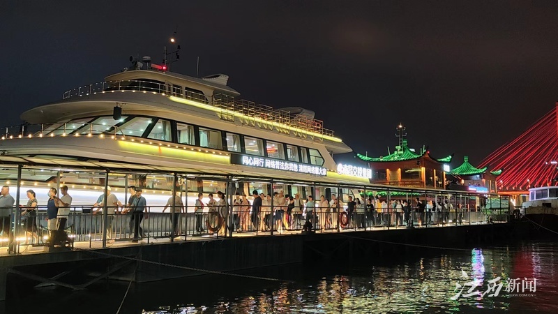 ▲6月13日晚,2023年“全國網絡普法行·江西站”活動采訪團登上滕王閣游輪,共同欣賞南昌一江兩岸網絡普法主題燈光秀。攝影丨王靜儀