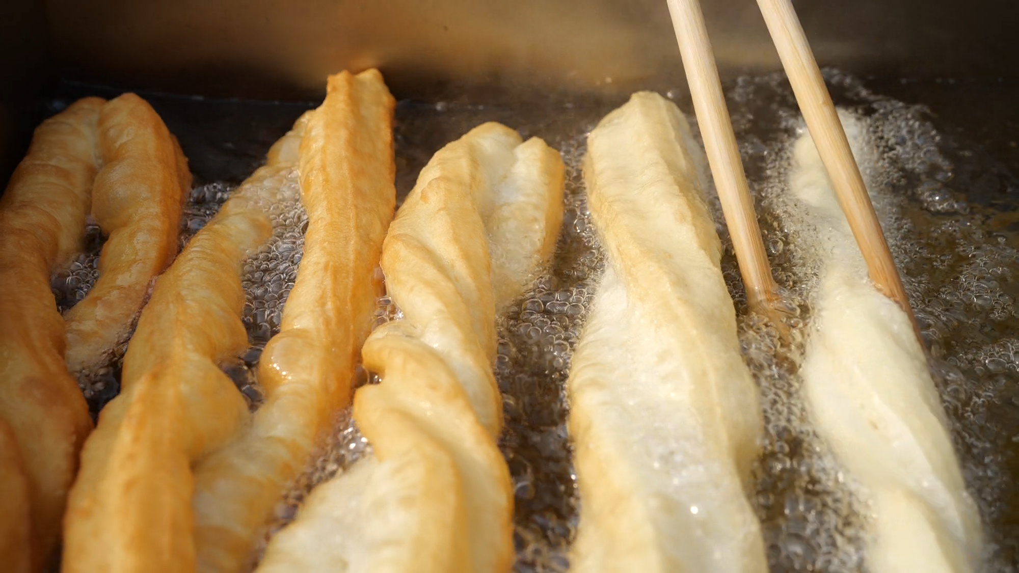 史梅菊賣早餐賣了二三十年,今年她和小叔子江新軍代表江莊村參賽。為防止面團粘連,史梅菊用搟面杖在油鍋里沾點油后,再把面團搟成長面餅狀。用刀快速切條,兩個面餅條疊在一起,史梅菊再用手摁壓幾下,給油條在鍋里留足發酵空間,以此保持油條的蓬松感。江新軍負責不停地翻轉鍋里的油條。