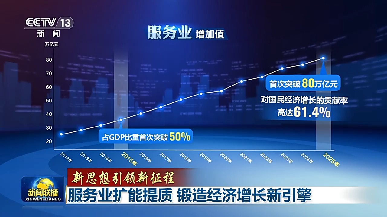 2015年,服務業增加值占國內生產總值的比重首次突破50%,此后連續11年占據國民經濟半壁江山。2025年服務業規模首次突破80萬億元,對國民經濟增長的貢獻率高達61.4%,作為經濟社會發展的主引擎地位更加堅實穩固。