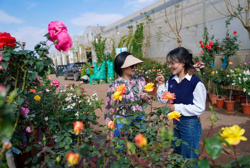 2025年4月11日,越南花商阮翠云(左)與翻譯李青歌在云南昆明斗南一花卉基地內查看鮮花品質。2018年,阮翠云開始在越南銷售云南花卉,讓七彩“云花”成為眾多越南家庭的“常客”。借助高效的電商平臺和快捷的物流網絡,鮮花從云南花田到河內貨架實現了“次日達”。