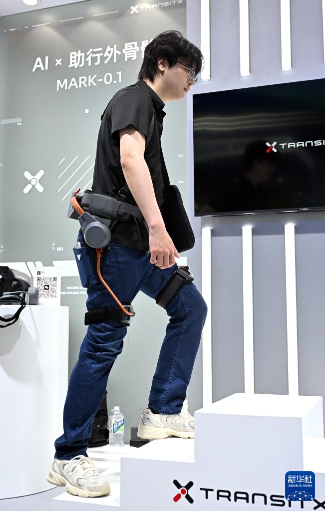 4月14日,參觀者在第六屆消博會現場體驗一款AI助行外骨骼。