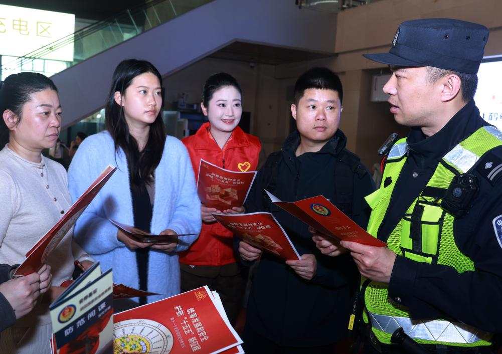 4月13日,武漢鐵路公安處民警、志愿者在湖北省漢口站向旅客宣講防范化解危害國家安全行為的知識。新華社發(趙軍 攝)