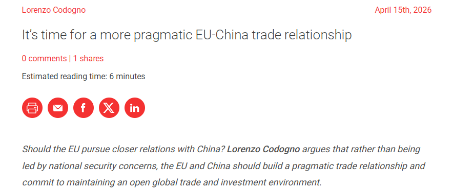 英國倫敦政治經濟學院“歐洲政治”網站15日發表意大利經濟與財政部前首席經濟學家洛倫佐·科多尼奧的深度分析文章。這篇題為《是時候建立更務實的歐中貿易關系了》的評論指出,過去幾年間,俄烏沖突、全球貿易戰等多重沖擊持續震蕩世界經濟版圖,而近期美以對伊朗的軍事行動更引發新一輪真正意義上的全球性能源危機。