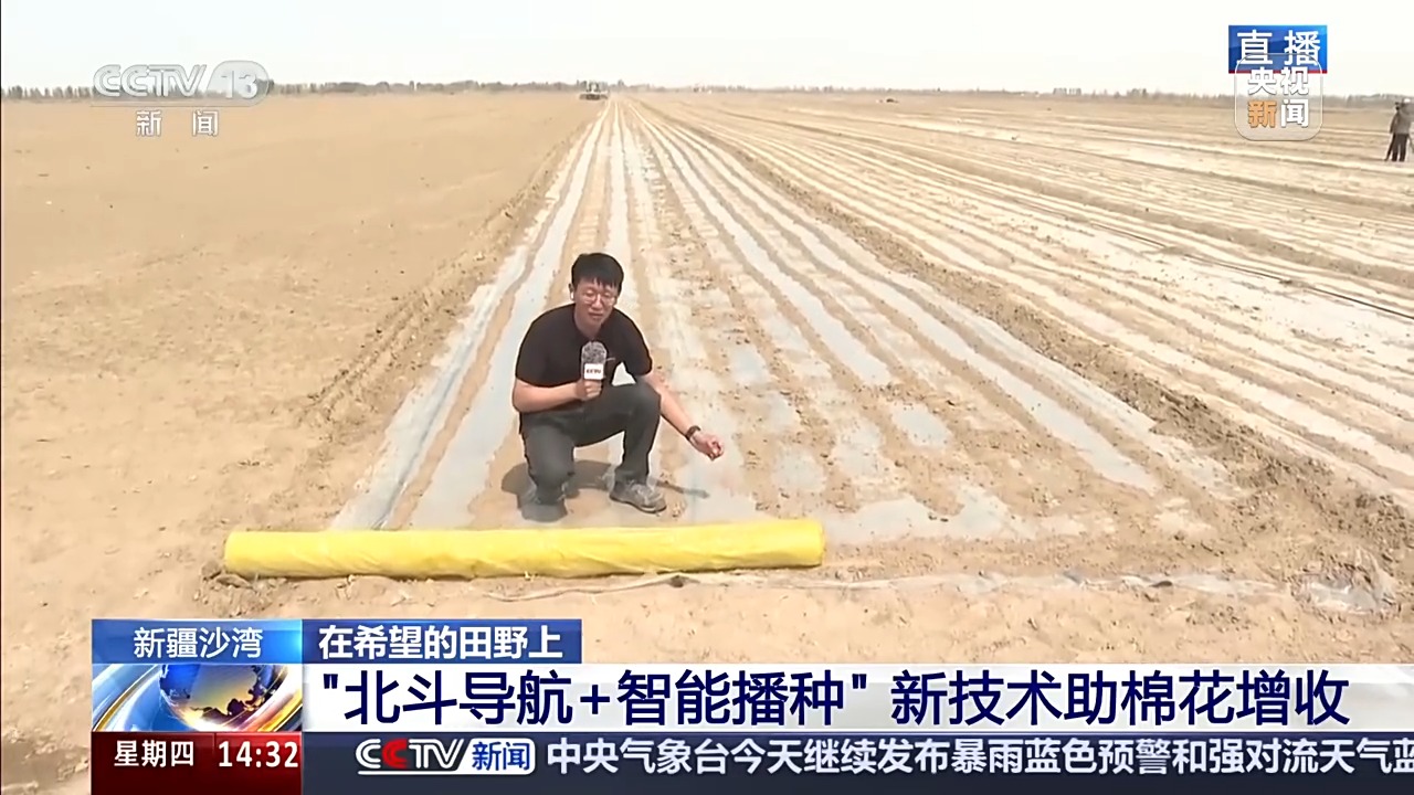高鵬飛:您瞧,我身后這臺(tái)棉花播種機(jī),正不緊不慢地往前開。從空中看下去,播完種的土地就像鋪上了一條條透明的絲帶,筆直筆直的。怎么能做到這么整齊劃一?全靠有北斗導(dǎo)航的無人駕駛設(shè)備。這種設(shè)備精度很高,每公里誤差不超過2厘米。為什么要這么精準(zhǔn)?因?yàn)楹竺娴闹懈⒋蛩庍@些田間管理,也都靠帶著北斗導(dǎo)航的設(shè)備來干。這樣從播種到管理,環(huán)環(huán)相扣,無縫銜接。像這種復(fù)合式精量化播種機(jī),后面還掛著好幾個(gè)裝置,它一過,鋪設(shè)滴灌帶、地膜、打孔、下種、覆土一氣呵成。一臺(tái)機(jī)器一天能干120多畝,效率那是翻著跟頭往上漲。