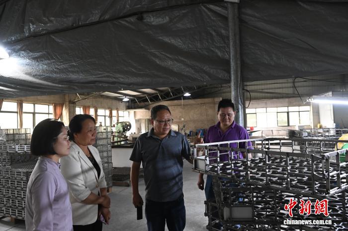 圖為莊文祈(右二)和莊鈦德(右一)向來客介紹工廠生產情況。中新網記者 蔣雪林 攝