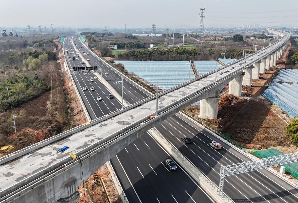 2月10日,成渝中線(xiàn)高鐵四川段橋梁建設(shè)全部完成。這是當(dāng)日在成都市拍攝的成渝中線(xiàn)高鐵最長(zhǎng)橋梁龍泉特大橋跨滬蓉高速公路(無(wú)人機(jī)照片)。新華社記者王曦 攝