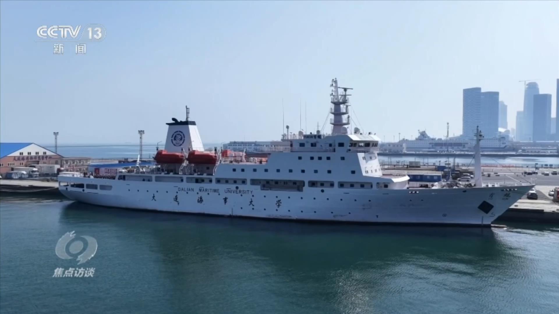在我國首艘專用教學實習船“育鯤”輪上,大連海事大學的師生們在甲板上莊嚴宣誓,以青春之名立強國之志,向歸來的志愿軍英雄們致敬。