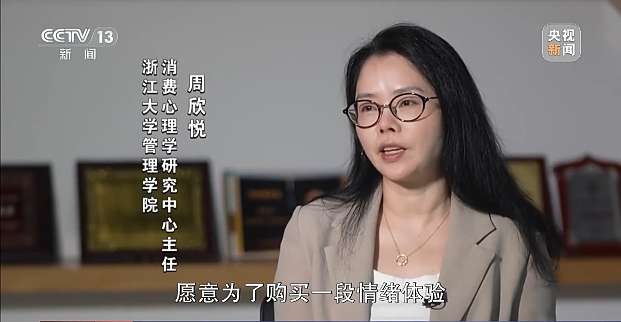 浙江大學管理學院消費心理學研究中心主任 周欣悅:情緒消費其實是消費者愿意為了購買一段情緒體驗,而進行的消費行為,而且愿意去支付溢價,也就是愿意額外再多花錢。我們消費者的關注點,從外部物質世界轉換到內心精神世界的這樣一個過程。