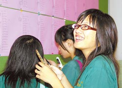 臺灣大考昨天放榜,在臺北“北一女中”,學妹認真尋找熟悉學姐的名字,一看到榜上有名,趕在第一時間傳送簡訊報喜。(臺灣《中國時報》圖片)