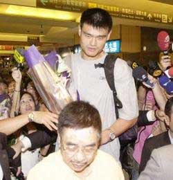 中國臺灣網9月8日消息 美國職籃(NBA)第一長人,有“移動長城”之譽的大陸球星姚明,昨天下午3時40分抵臺,展開3天的籃球訪問之旅。姚明在抵達機場時受到球迷熱烈歡迎,尖叫聲不斷;由于身材太高,姚明在旅客中鶴立雞群,通關過天花板時都要低頭彎腰。