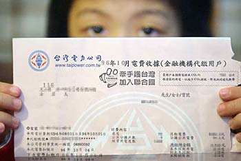 臺當局推動“入聯”無所不用其極,連電費賬單也不放過,“入聯”至此算是讓人大開眼界!吨袊鴷r報》 范揚光攝