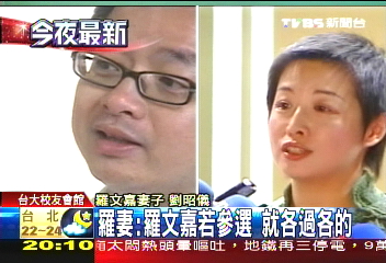 據臺媒報道,陳水扁力邀羅文嘉重披戰袍,參選臺北市大安區的區域“立委”,但羅妻劉昭儀卻強烈反對丈夫再出來參選。劉昭儀23日接受訪問時證實,她已經向羅文嘉明確表達,若決定參選,兩人必須各自過各自的生活,她不會再參與選舉了。