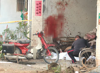 臺灣屏東縣恒春鎮昨天下午發生爆炸案,趙進玉在敲打撿回的炮彈時被炸死。墻上噴濺的血漬,令人觸目驚心,現場一片狼藉。 (臺灣《聯合報》圖片)