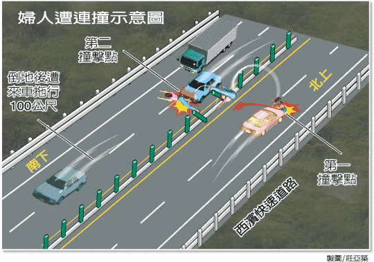 許嘉宏說,報案后他在車內等候,沒多久聽到南下車道又傳來猛烈撞擊聲,他趕緊下車,只見婦人尸體被拖行百余米,地上血跡斑斑,“好可怕”,他嚇得不敢靠近。