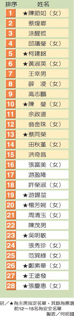民進黨不分區“立委”提名排序 臺灣《聯合報》圖