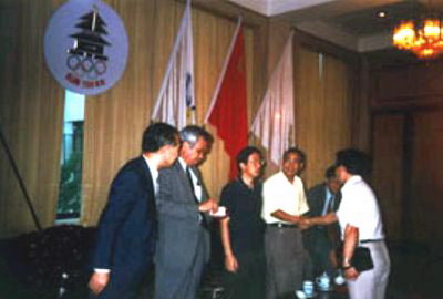 1993年謝長廷(黑色短袖衫,左三,五星紅旗下)、前民進黨主席姚嘉文(白發(fā)者,左二)、民進黨“立委”蔡同榮等人前往大陸訪問,在北京機場貴賓室內(nèi)于五星紅旗下合影。(《中國時報》圖)