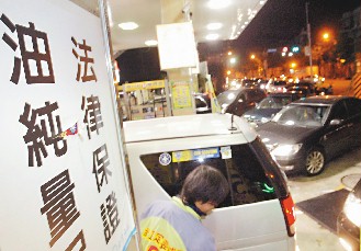 臺灣傳出加油站賣假油,一家加油站特意打出“法律保證、油純量足”,讓顧客安心。(聯合報圖)