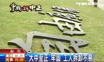 中國臺灣網12月7日消息 “臺灣民主紀念館”(原名中正紀念堂)拆除“大中至正”牌匾今天上午動工,拆除工作2小時并不順利,僅拆除園區內牌匾“正”字一顆螺絲;施工人員中午采買工具后,午后繼續拆除,截止發稿時止,相關工作人員已用吊車將“中”字拉了下來。