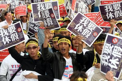 臺(tái)灣移工聯(lián)盟9日在臺(tái)北市舉行“我要休假——臺(tái)灣移工大游行”,來自全臺(tái)各地的外勞一起爭(zhēng)取休假權(quán)!爸醒肷纭庇浾哙嵔芪臄z