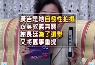 據報道,9年前臺灣高雄市長選舉期間,島內知名藝人白冰冰拍攝廣告,公開批評謝長廷“不是人”。這段廣告不但使高雄選情掀起波瀾,還使謝長廷以此控告當時的競爭對手吳敦義。最后謝長廷當選,吳敦義落敗。當年白冰冰就表示,廣告完全是她自發拍攝的,與吳敦義無關,拍攝廣告主要是因為謝長廷曾為白冰冰女兒被殺案的主嫌辯護。