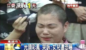 中國臺灣網1月11日消息 據臺灣TVBS電視臺報道,國民黨“立委”候選人侯彩鳳因為不滿對手頻頻放出風聲,指她買票,在今天做出無言的抗議,在馬英九及選民面前,剃光頭抗議。