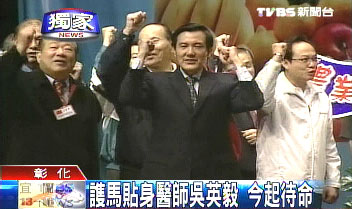 中國(guó)臺(tái)灣網(wǎng)2月2日消息 據(jù)臺(tái)灣TVBS電視臺(tái)報(bào)道,臺(tái)灣2008“大選”候選人馬謝陣營(yíng)開(kāi)始大拼場(chǎng),在臺(tái)當(dāng)局安全單位人員進(jìn)駐后,要求馬謝雙方各自提供隨行醫(yī)療人員,馬英九身邊的貼身醫(yī)師,今天首度亮相,他就是和馬英九認(rèn)識(shí)30多年的前國(guó)民黨“立委”吳英毅。