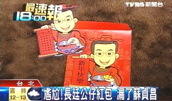 謝長廷發(fā)出的公仔紅包,造型活潑,但紅包袋上卻漏掉了其副手蘇貞昌的名字,面對記者的詢問,謝長廷一時無語。