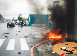 謝菁華遭撞后,整個人彈到數米外,摩托車起火冒煙,可見撞擊力有多強。(聯合報圖)