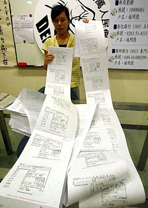 “百萬人民倒扁運(yùn)動(dòng)”當(dāng)初募得巨款,工作人員展示大疊郵局劃撥單據(jù)。(臺灣“中時(shí)電子報(bào)”圖)