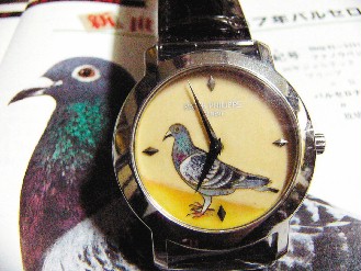 這是瑞士百達(dá)翡麗打造的彩繪表,表面上的賽鴿圖案是黃良德飼養(yǎng)的“新世紀(jì)”,它曾得過(guò)世界越洋冠軍,現(xiàn)已24歲高齡。