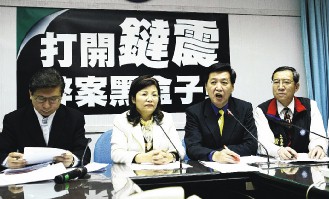 國民黨“立法院”黨團書記長郭素春(左二)、“立委”費鴻泰(右二)等上午舉行記者會,質疑臺當局“國防部”投資鐽震公司過程疑點重重。 (臺灣《聯合晚報》圖片)