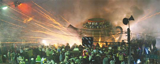 中國臺灣網2月22日消息 臺灣臺南縣鹽水鎮元宵蜂炮昨晚萬箭齊發,鹽水小鎮像座“被點燃的火藥庫”,神轎隊伍分三路穿梭鬧街,迎接蜂炮洗禮;逾萬游客有如“置身槍林彈雨”,鹽水鎮愈夜愈熱鬧。
