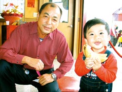 2歲男童蘇玟丞連擲了19個圣筊,贏回一輛汽車,祖父蘇寶琳(左)在一旁笑得合不攏嘴。(臺灣《中國時報》圖片)