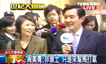 馬英九在夫人周美青及幕僚人員陪同下,于下午1時抵達辯論會場。馬英九表示自己心情平靜。對外界普遍看好謝長廷口才,周美青則認為,只要大家盡力就好。當被問及如何幫助馬英九時,周美青只說會建議馬英九放輕松,“我不是他的督軍,只是在旁邊倒茶水”。