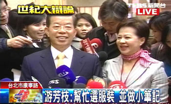謝長廷也同樣偕夫人一起提前抵達辯論現場。謝長廷穿戴著由夫人挑選的深藍色西裝和黃色領帶,表示以平常心看待辯論。在辯論開始之前,游芳枝幫丈夫記了許多小筆記,寫在小卡片上。 (云鵬)