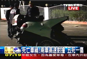 據臺灣“中廣新聞”報道,臺北縣警方調查指出,凌晨2點左右,在云林縣云145線北港路段,兩部分別南下北上的小客車,不知何故,發生對撞,造成這起5死1重傷的重大車禍。