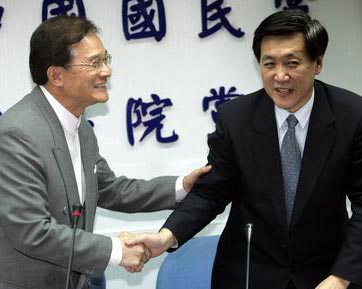 臺當局新任“國防部長”蔡明憲(左)25日拜會國民黨“立法院”黨團,與國民黨“立法院”黨團書記長費鴻泰(右),溝通鐽震公司解散議題。臺灣“中央社”