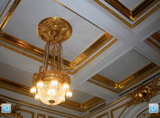 臺北賓館全館一樓中央廣間的“鍍金工程”,將純白的屋頂及墻面都貼上金箔框飾,與百年的水晶燈相互輝映。(臺灣東森新聞圖片)
