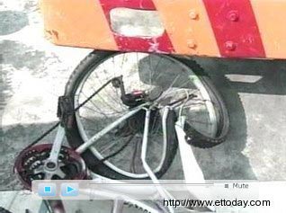 狠心貨車撞單車女童,不理哭喊拖1公里,自行車嚴重變形。來源:臺灣東森新聞