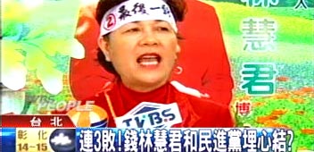 TVBS報(bào)道稱,2004年“立委”選戰(zhàn),大綠(民進(jìn)黨)小綠(臺(tái)聯(lián)黨)配票失敗,臺(tái)聯(lián)黨錢林慧君高票落選;2005年錢林慧君投入臺(tái)南市長(zhǎng)選戰(zhàn),最后敗給民進(jìn)黨。今年“立委”選戰(zhàn),臺(tái)聯(lián)黨更因?yàn)樾逻x制全軍覆沒(méi)。臺(tái)聯(lián)黨內(nèi)部透露,錢林慧君早已轉(zhuǎn)向鷹派,主張和民進(jìn)黨開戰(zhàn)。