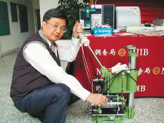 臺檢方查扣偽鈔集團使用的防偽線機,調查人員示范操作。(臺灣《聯合報》圖片)
