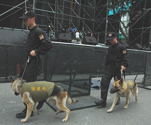 3月22日,臺灣地區領導人選舉投票日,臺警方及安全人員拉緊神經,下午特別到民進黨候選人謝長廷競選總部加強檢查,特別還帶了偵爆犬進行偵測。(來源:臺灣聯合新聞網)