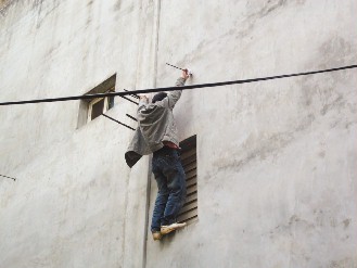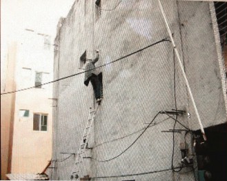 慣竊鄭某涉嫌闖空門,被人發現后自三樓窗口爬出,抓著墻邊凸出的鋼筋,企圖逃走。
