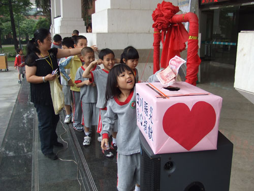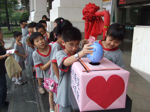 中國臺灣網5月19日北京消息 小朋友們排排隊,有的捧著自己心愛的存錢罐,有的緊握著自己的壓歲錢,還有的從爸爸、媽媽那里為災區小朋友爭取來善款,挨個走到與自己差不多高的募捐箱面前,踮起腳,將自己的愛心投進去。