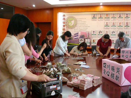 學生踴躍奉獻愛心的同時,許多教師及行政人員也繼5月13日捐出一日薪資所得及一月休閑費用后,在學生的愛心鼓舞下,再次捐獻。