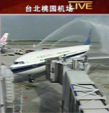 中國臺灣網7月4日消息 據中央電視臺報道,今天上午從廣州起飛的包機航班8點05分許抵達臺北桃園機場后,臺灣方面準備了盛大的歡迎儀式。為了幫大陸觀光首發團“洗塵”,臺灣方面效仿“新船入港”迎接方式,包機飛抵機場后,用消防車在停機坪對飛機進行“噴水歡迎式”。(李杰)